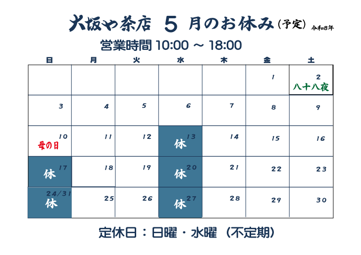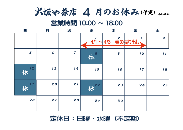 4月のお休み 2026年4月4日/カテゴリ: Uncategorized /作成者: admin 予定ですので変更になることがあります。 今年度から水曜、日曜休みにしましたが、3月までは水曜日は、一日もお休みできませんでした。なかなか今までの流れを変更していくのは大変です。 臨時休業する場合は店頭、ホームページでお知らせします。 https://ohsaka-ya.com/wp-content/uploads/2026/04/月のお休み202604.gif 516 729 admin https://ohsaka-ya.com/wp-content/uploads/2021/03/logo-v-tr.svg admin2026-04-04 08:18:502026-04-04 08:39:474月のお休み